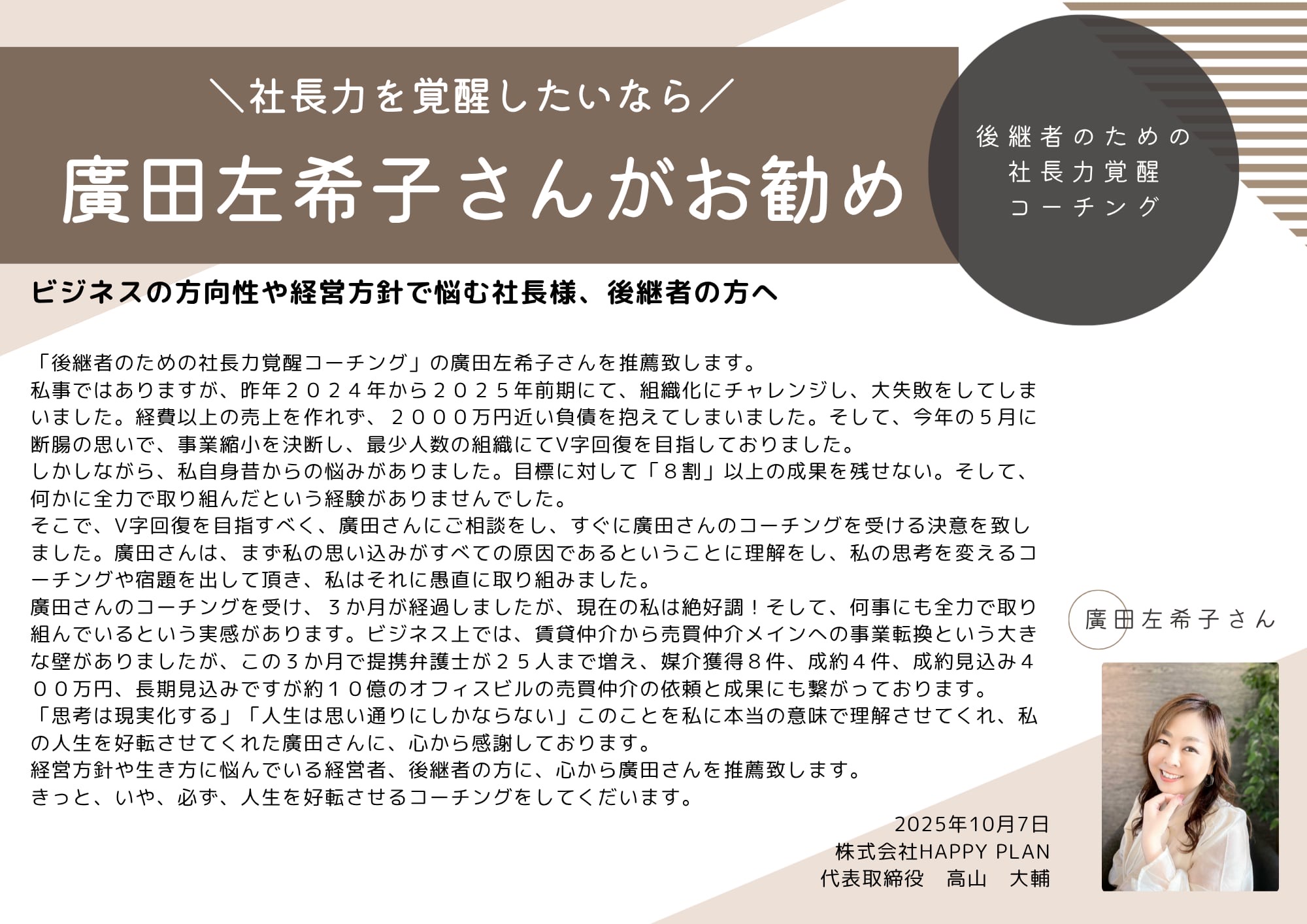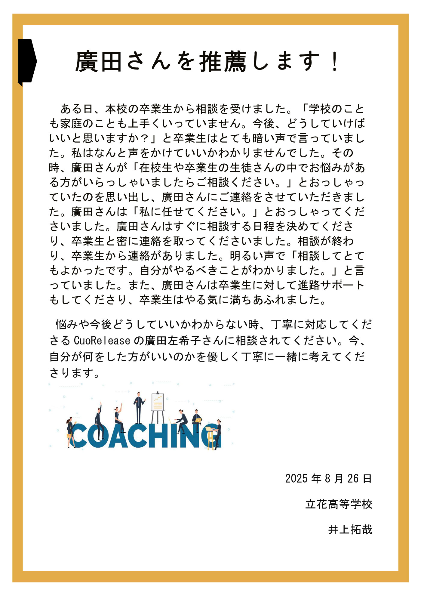 コーチングを受講する以前と比べ、格段に生きることが楽になり、自分への愛情も感じられるようになりました。将来は、廣田先生のようなコーチを目指したいと思っています。